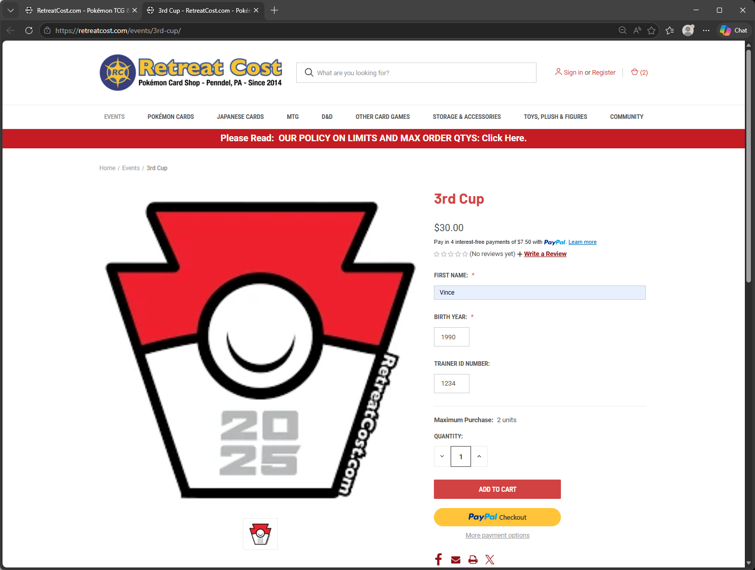 - Close the Cart and go Back to the Event again,